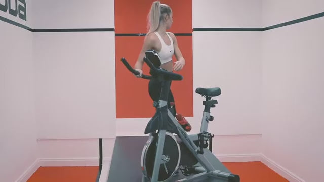 bicicleta spinning PRO banda magnética con soporte para iPad y cómodo cojín de asiento y volante de 18 KG