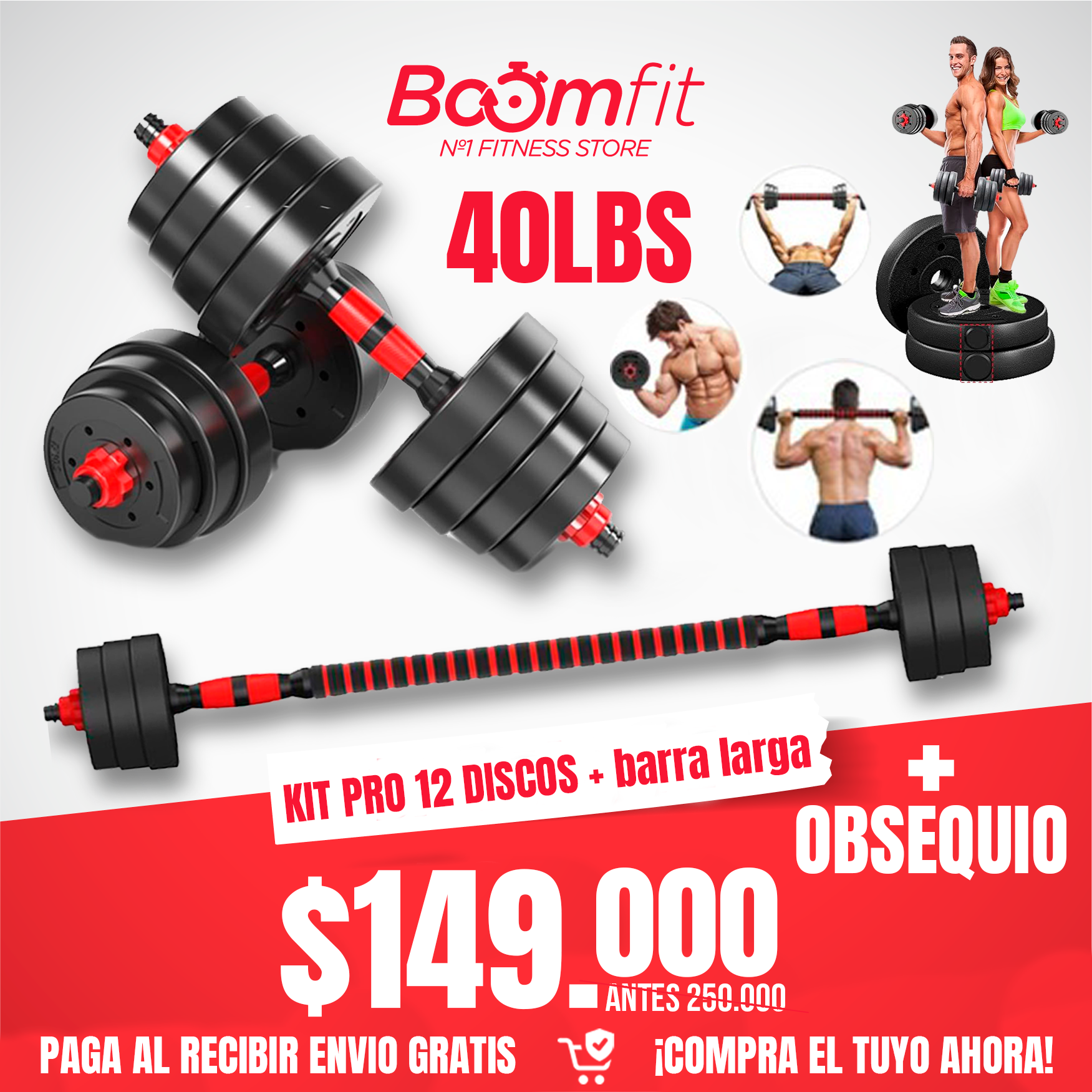 Kit pesas 40 libras PRO Multifuncional + barra larga 1,40 M + LAZO PRO DE SALTO