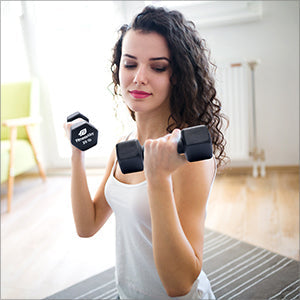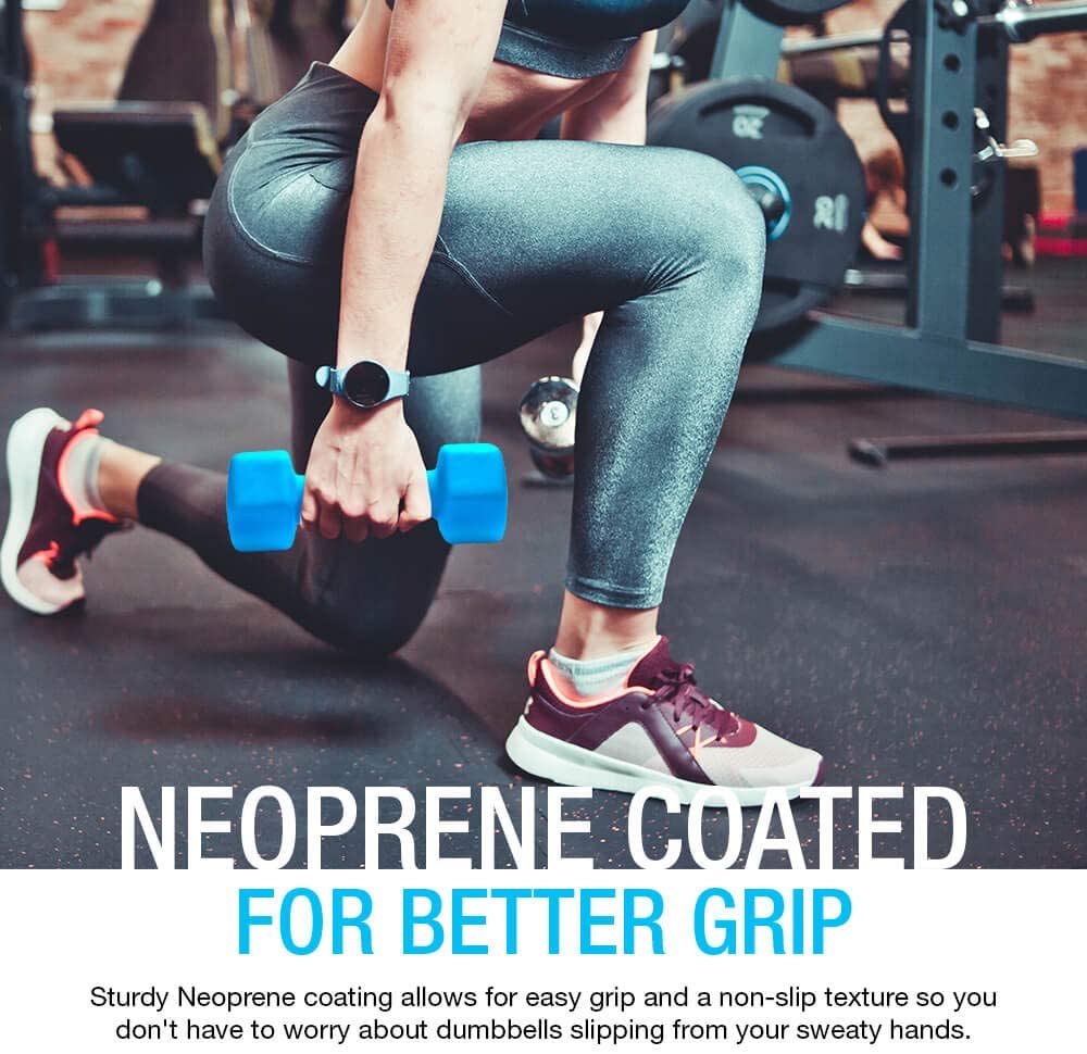 Revestimiento de neopreno resistente que permite un agarre fácil y cómodo en la mano y una textura antideslizante para que no tengas que preocuparte de que las mancuernas se resbalen de tus manos sudorosas. Pesos antideslizantes, neopreno protege el suelo de daños.